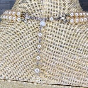 Trifani light champagne double strand faux pearl choker style necklace. Hook closure features rhinestones at the end of each side of the necklace. There is a faux pearl extension with 1 pearl peeling, that is the only defect that I could find. Interior of hook closure is stamped "Trifari".