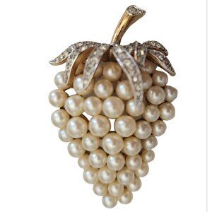 This Trifari Gold Tone Clear Rhinestone Faux Pearl Grape Cluster Brooch Pin is a great addition to your vintage Trifari costume jewelry collection. Measures approximately 2 inches in length, it features a grape cluster design with shimmering clear rhinestones and lustrous faux pearls set in a gold-tone metal base. The back is marked with a crown over T TRIFARI and ends with a copyright symbol ©. The pin back is secure and a breeze to attach to your favorite clothing or accessory.