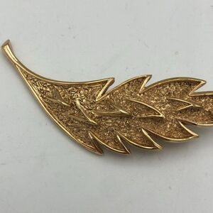 Cute little feather / leaf shaped vintage brooch. Made by Trifari. Gold tone. Pins at the back.