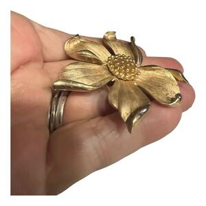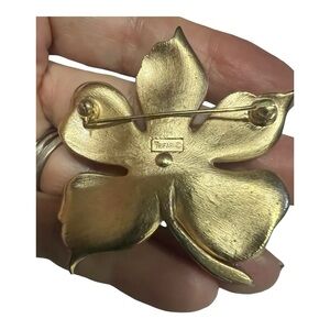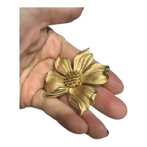 Elegant gold tone floral brooch by Trifary. perfect for adding a touch of sophistication to any outfit This five petal flower brooch verses the four petal is saught. after by collectors.