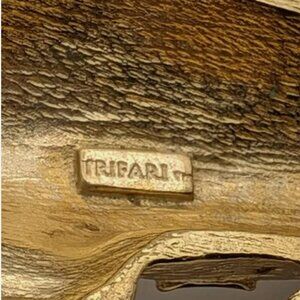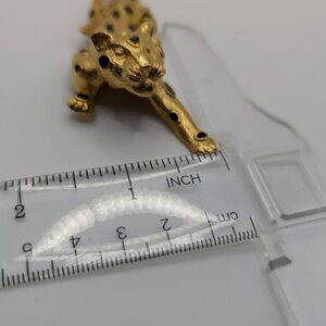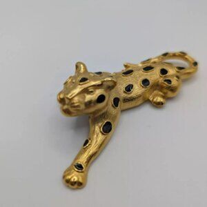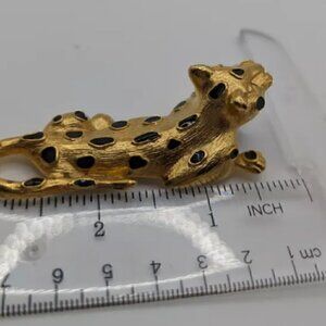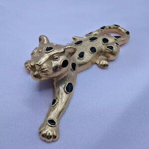 Elegant leopard brooch by Trifari. Features gold-tone body with black spots. Perfect for adding a touch of luxury.