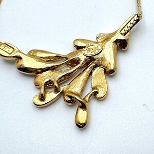 This vintage Trifari jewelry necklace and clip on earring set showcases timeless elegance with its gold-tone finish and cream enamel leaf motif, suitable for formal or casual wear.