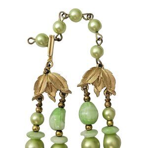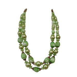 This is a very stylish necklace made by Trifari, a well-sought vintage costume jewelry. This Trifari necklace features two strands of alternating green round and oval glass beads enclosed between the ornate metal. Marked TRIFARI on Shepherd's J hook. It measures 16 inches long, making this a great piece to complete your look.