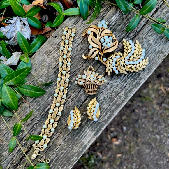 Vintage circa 1970s Crown Trifari gold tone faux pearl leaf 5 pieces set: 3 brooches, bracelet and pair of clip on earrings.