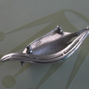 Sophisticated metal feather with accent. Pins elegantly on dresses, suits or sweaters.