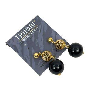 Trifari Surgical Steel Post Earrings Gold Black Ball Drop Pierced Vintage Jewelr