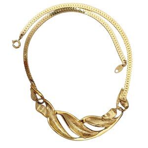 The glamour and beauty of the past continue to permeate modern styles and designs simulated in this piece of accessory by Trifari. It features a gold-tone flat herringbone pattern chain, the collar is constructed with three flat swirling panels in an openwork and accented with intricately detailed intertwined gold tone leaf design decorated with glazed marbled gray, beige, and pearly enamel on each of three panels. This stylish statement collar necklace measures 16 inches in length. The back of the collar is marked TRIFARI TM, dating from circa 1980-90s. Pieces with this marking are the last signed Trifari pieces featuring high-quality and stunning designs. This necklace has a spring ring closure for a secure fitting. This necklace will make a great heirloom piece for generations to come.