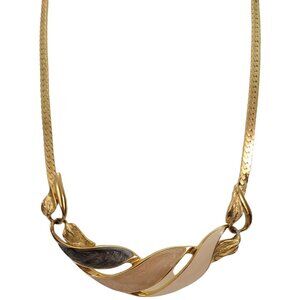 Trifari TM Gold Tone Gray Beige Pearly Enamel Leaf Collar Chain Necklace, E882