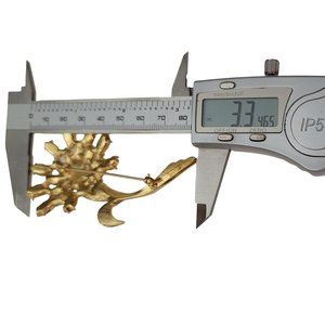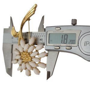 Trifari is a well-known American jewelry company renowned for its high-quality designs. This stunning Trifari Flower Brooch features marquise-shaped milk white plastic that depicts the flowers petals, these are set on the radiant gold tone stemmed flower base metal, ensuring durability and longevity.. It measures approximately 1.8 inches in width and 3.3 inches in length. Signed TRIFARI TM on the reverse, this is Trifari markings seen on items produced during 1980-90s. The back is secured with a locking pin that functions properly and is in vintage condition. This Trifari pin highly coveted for its stunning designs and for its timeless and elegant look.