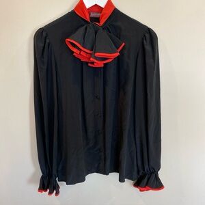 Trigeresport For Schrader 100% Silk Black Long Sleeve Top Red Ruffle Accents