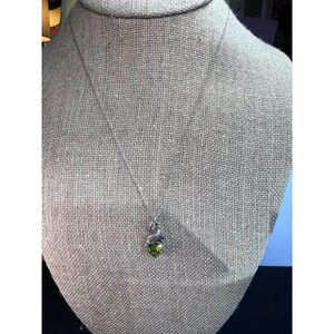 Trilliant cut peridot stone in a rhodium over sterling silver prong setting. White accent stones on the pendant spiral are most likely zircon. Chain measures 18 inches. 925. DK