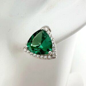 Beautiful trillion cut pariaba gemstones. 6.30 carats total carat weight. Orangish is certain light - green in other (more direct) light. Pretty small white gemstones surrounding main stone. All gemstones are lab created. Sterling Silver (.925).