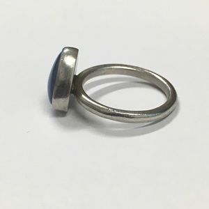 Gorgeous trillion-shaped lavender chalcedony bezel set in sterling silver and rests on a brushed matte sterling silver band.