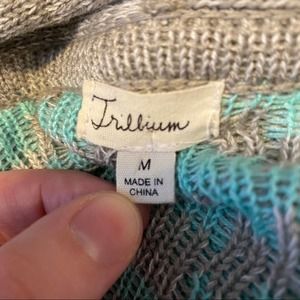 Trillium Open Front Gray Cascade Cardigan. Tassel. Long sleeve. Gray and teal. Aztec design.