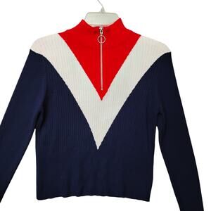 Trillium Ribbed Colorblock Top Size Large Blue, White and Red Zip Up Long Sleeve