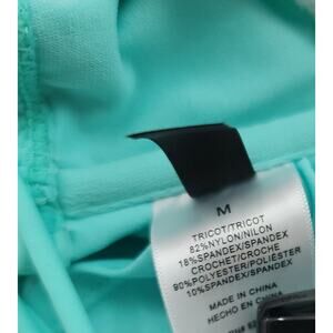 teal, white lace flounce, halter style, pull on, stretchy braided straps, padded, lightweight