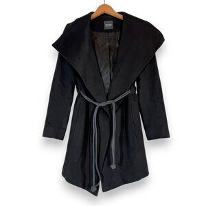 Elegant and timeless black wool wrap coat from Trilogy Collections by Michael McCollom. Crafted in the USA using luxurious 100% wool fabric by Loro Piana (Italy) — known worldwide for their exceptional quality and softness. This coat features a dramatic wide collar, cinched waist with self-tie belt, and a flattering asymmetrical hemline for a modern yet classic silhouette.