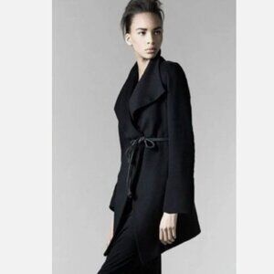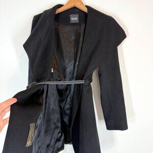 Elegant and timeless black wool wrap coat from Trilogy Collections by Michael McCollom. Crafted in the USA using luxurious 100% wool fabric by Loro Piana (Italy) — known worldwide for their exceptional quality and softness. This coat features a dramatic wide collar, cinched waist with self-tie belt, and a flattering asymmetrical hemline for a modern yet classic silhouette.
