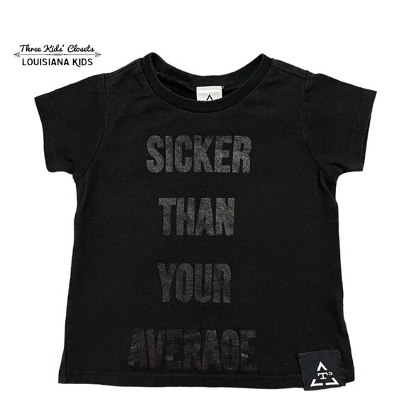 This cute T-shirt features a short sleeve crewneck style in a solid, black color. It has large words down the front, also in black, that say, “sicker than your average.” Mild wash wear. VGUC Size 6m