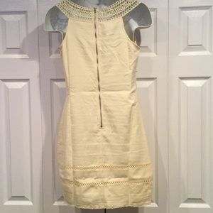 Sheath dress with a crochet trim collar around the neck and small pin tucks around the body. Also detailed with small lace trim near the hem. Excellent quality, dress has stretch to it. 100% polyester size chart is in last picture