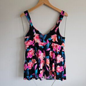 Vibrant floral tankini swim top with pink and blue flowers on a black background.