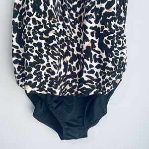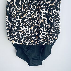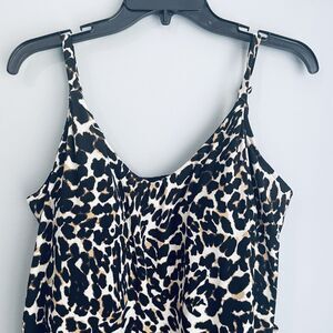Trimshaper plus size one piece leopard swimsuit size 14W. Has padded bra, adjustable straps, and lots of ruching at tummy. Looks and feel great with this amazing technology that makes you look and feel trimmer in seconds!