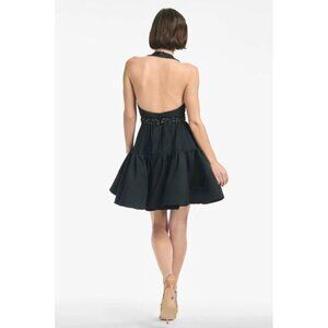 This classic black halter dress is perfect for any special occasion. It features a tiered mini skirt and open back, with an embellished belt for a hint of sparkle and added detail. In lightweight faille, Trina is sure to keep you feeling comfortable and looking beautiful.