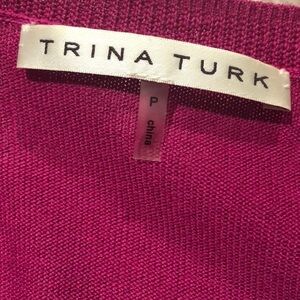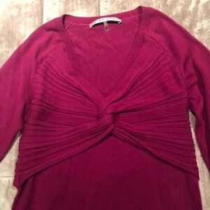 Beautiful Raspberry Colorer TRINA TURK 100% Merino Wool Twist V-Neck Sweater. Worn once in like new condition. Measures 14 inches at the bust the V measures 7 inches down, the sweater is 22 inches long. arms are 11 inches from the arm pit and 19 inches from the shoulder. I love this sweater but it unfortunately no longer fits me because it is size petite.