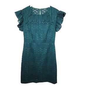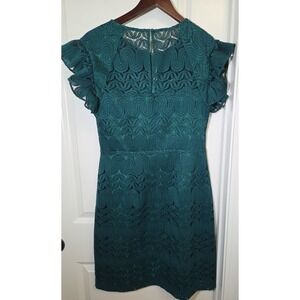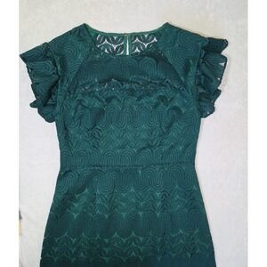 Description: Gorgeous Trina Turk dress. Emerald green fabric lace, lined. Back Zip plus open hook and eye neckline. Wear from Easter to Christmas.
