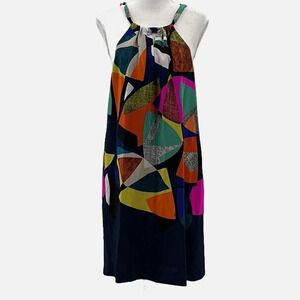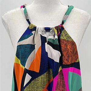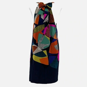 Trina Turk 100% Silk Abstract Print Halter Dress - Size 6. Excellent pre-owned condition. There is a perfume smell on the dress. 100% silk body and tie, polyester lining with lace edging. Popover style with tie at neck back. Keyhole opening front and back. Approximate measurements: 19" pit to pit, 32" length. Multi color jewel tones.