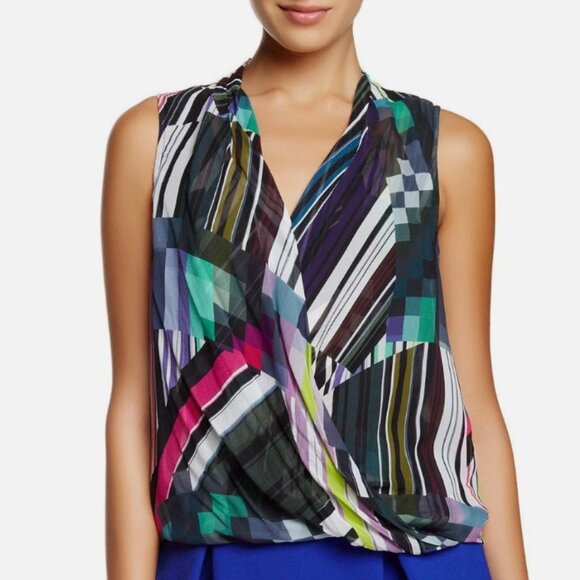 Trina Turk 100% Silk Layered Surplice V-Neck Sleeveless Top Pixel Stripes Size S