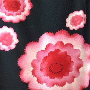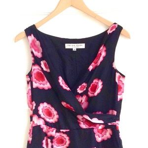 Elegant Trina Turk 100% Silk Sleeveless Sheath Dress in a dotted black fabric with a cascading floral pattern in shades of rose & raspberry. Sumptuous silk with a sexy, low, draped V neckline, faux wrap style & waist defining darts. Concealed back zip, back kick pleat. Bodice lined in back, skirt fully lined, lining is hemmed in pretty black lace (see photos). Approx measurements flat: armpit-to-armpit 17", waist 14", length shoulder to him 38". Excellent condition, worn twice. Beautiful! 🌷