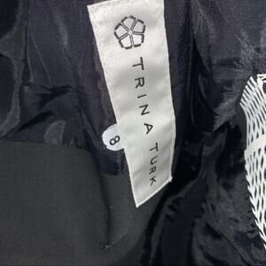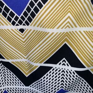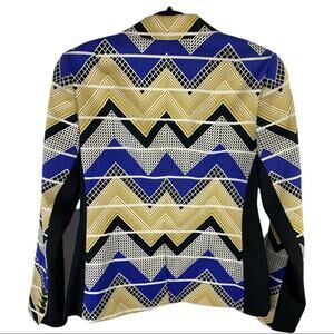 Zig zag pattern. White, blue, mustard green, black. Two button closure. Contrasting lapel. Geometric print. Gently used, pre-loved condition.