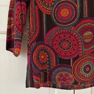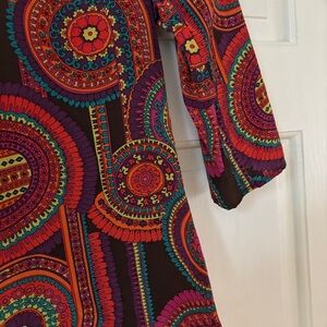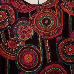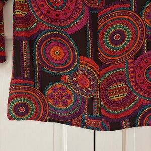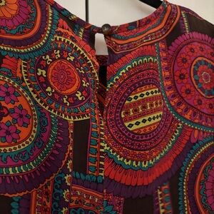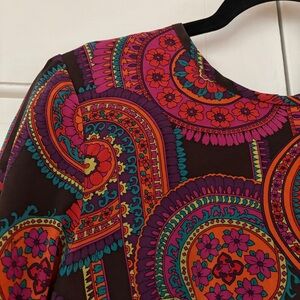 Bright floral print with some abstract extras! Beautiful simple silhouette with 3/4 sleeves, button closure on back featuring a keyhole, and rounded neckline. This Trina Turk blouse showcases a striking pink, orange, teal, purple, brown, and yellow graphic design, offering a relaxed fit with three-quarter sleeves. The vibrant pattern adds a bold touch to any outfit, making it a standout piece in your wardrobe. 100% silk makes it luxurious. Preowned no flaws.