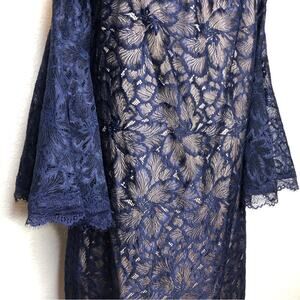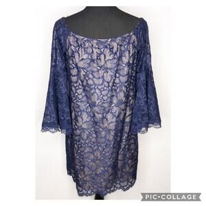 Trina Turk Akamai Lanai navy blue lace overlay off shoulder dress.