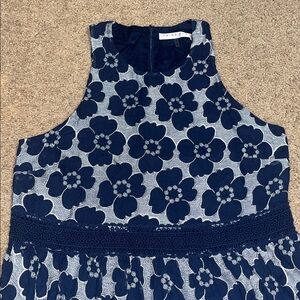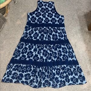 Trina Turk Alana Sleeveless Tiered Midi Embroidered Floral Dress Navy Blue 12. With intricate embroidery, a tiered skirt, and a flattering silhouette, this floral midi dress was made to stand out. Pair this dress with neutral sandals to make a showstopping entrance at your next get-together. Jewel neckline. Empire waist. Multi-tiered skirt. Decorative lace at waist and tiers. Back zipper. Midi length. Base: 100% Cotton. Approx measurements: 19.5“ pit to pit, 19“ waist, & 45.5“ length. Great pre-owned condition. No stains/flaws. Smoke/pet free home. Offers welcome. Bundle & save. Ship same/next day. Packaged w/ care.