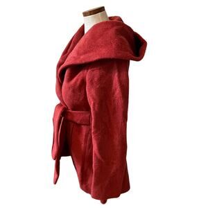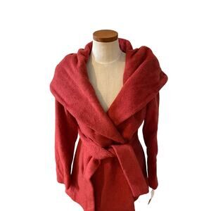 New Trina Turk wool and alpaca hooded and belted wrap coat in brick, size 2. Fashioned with classic flourishes cut from a luxurious wool blend, Trina Turk's double-breasted topper turns heads with a face-framing, statement hood and belt. Fully lined and so very soft! Beautiful rich color