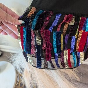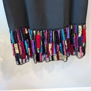 This chic black dress by Trina Turk features a vibrant multicolor sequins hem, perfect for adding a pop of color to your wardrobe. Ideal for any occasion, this dress combines classic style with a modern twist.
