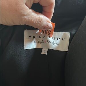 This Trina Turk wise 8 black blazer features a luxurious satin-like fabric with a notched lapel collar and a fitted silhouette, offering a sophisticated look for formal occasions.