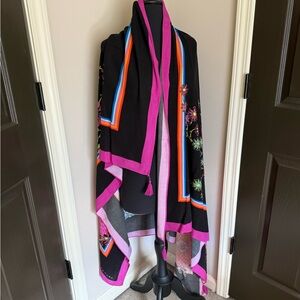 Elegant black scarf featuring bold floral patterns. Accents of pink, orange, and blue.