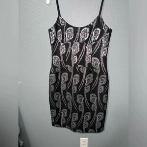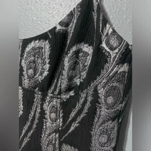 Trina Turk Black & Silver Peacock Lined Cocktail Dress Sz8 Wedding Party Formal. LIKE NEW!!! Zip back and boning on sides for a slim fitting look. Adjustable shoulder straps. Length from middle of chest to hem 31 inches. Length of back of dress to hem 29 inches. Armpit to armpit laying flat 17 inches.
