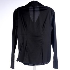 Super flattering fit Trina Turk inky black button down style twist front side zip shirt