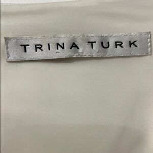 This stylish knee-length dress by Trina Turk features a striking two-tone color block design with short sleeves, a high cut v-neckline, and an hourglass silhouette effect in black and cream. Perfect for a chic and sophisticated look.