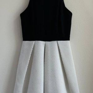 Detail: black and white A-line dress; black bodice and white honeycomb textured pleated skirt