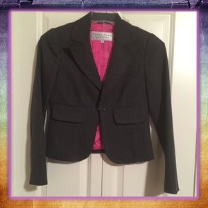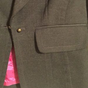 Trina Turk crop jacket notched collar, dual pockets at front, and single button closure at front. Slate/Dark Grey