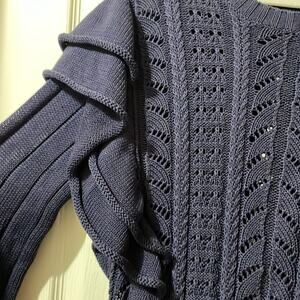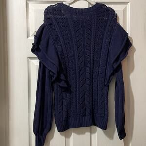 Trina Turk Navy Blue Pointelle Cable Knit Ruffled Long Sleeve Crewneck Sweater M
