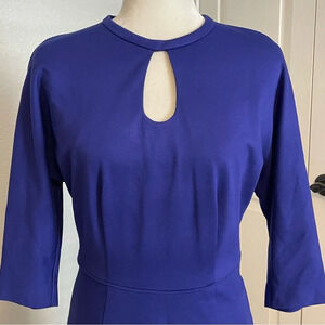 Beautiful Trina Turk sheath dress in royal blue. Keyhole neckline. 3/4 sleeves. Size and fabric tags have been cut out but it fits a size 6. Pit to pit 17”, waist 14” across, length 37”. Excellent condition