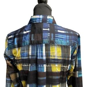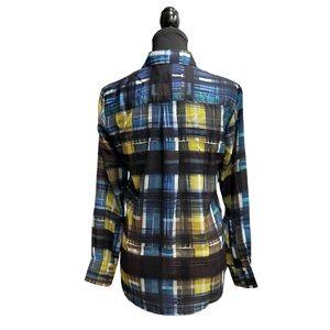 Trina Turk Blue Plaid Button Down Blouse | Size SP Petite | Office Dark Academia