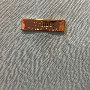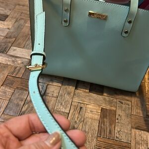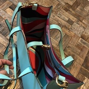 Trina Turk Turquoise Tote Bag with Fun Colorful Interior. Approx 10”x 11”x4”. 2 hand straps. A removable shoulder strap. Top inside closure. Inside zip pocket. Bottom studs