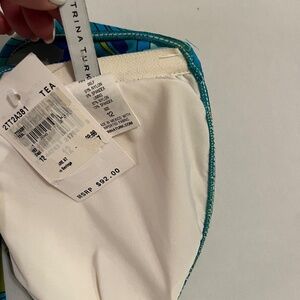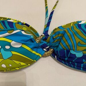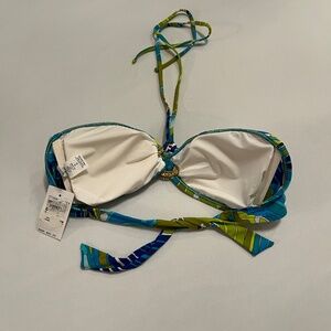 Stylish bikini top with vibrant blue and green patterns. Halter neck design. Perfect for beach days.